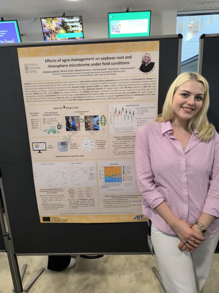 Anastasija Jušković, a second-year PhD student at the AIT Austrian Institute of Technology, had the pleasure of representing the MICROBIOMES4SOY project with a poster presentation at the 8th AMICI Symposium & Austrian Bioinformatics Workshop 2025, held in Vienna.